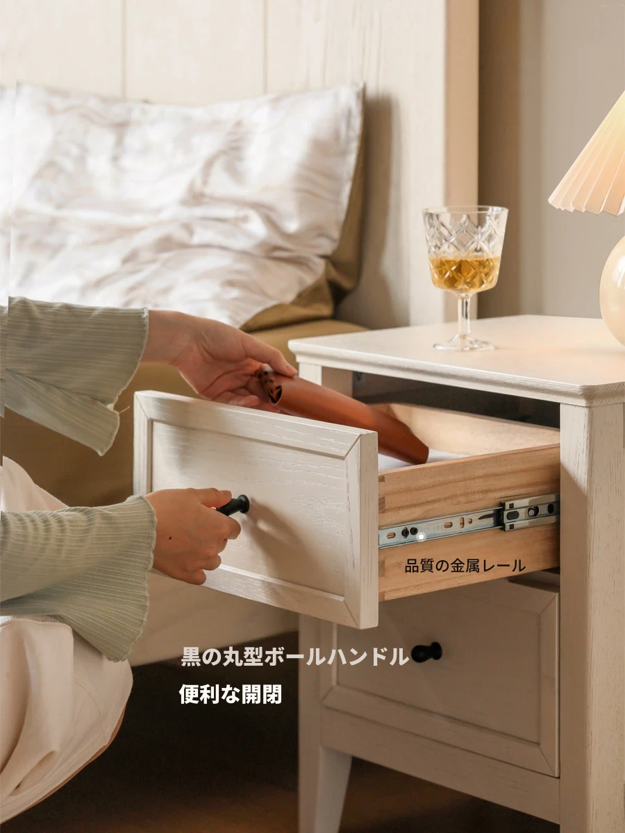 源氏木語の無垢材ナイトテーブル - おしゃれなクリーム色のアメリカンスタイル、コンパクトで機能的な収納力を持つ白い引き出し付きベッドサイドキャビネット。お部屋を素敵に演出します!