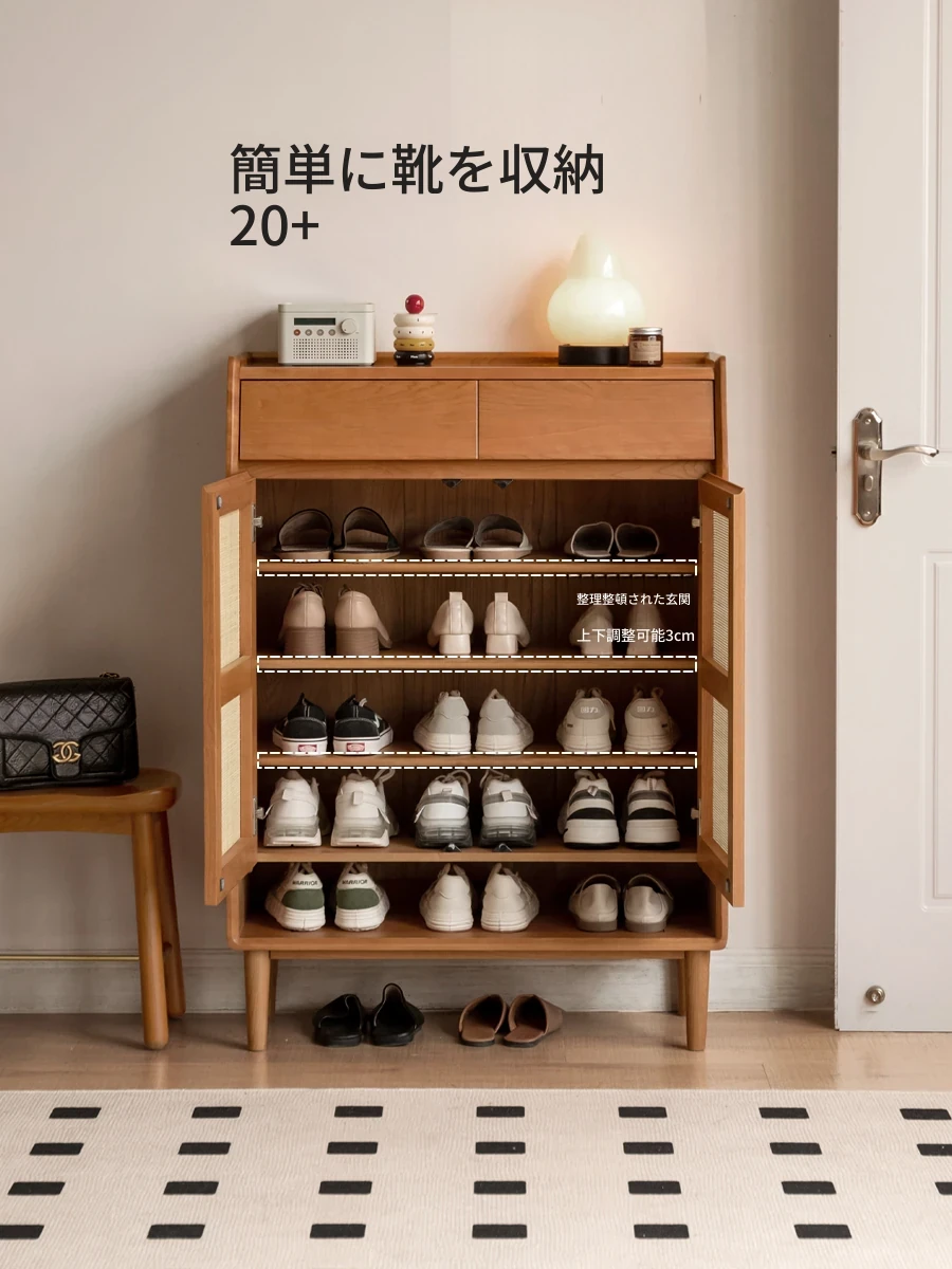 源氏木语天然木製シューズキャビネット - 家庭用エントランス収納!チェリーウッドとラタン編みの優雅なデザイン。リビングやバルコニーにも最適な収納力で、シンプルながらスタイリッシュな空間を演出します。