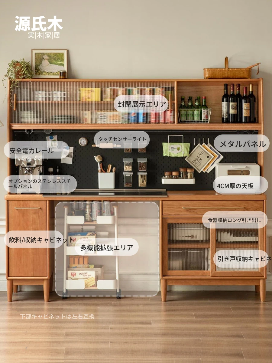 源氏木语 こだわりの無垢材使用!壁にぴったりフィットする日本式チェリーペ木製ハイキャビネット|スタイリッシュで機能的なダイニングサイドボード|収納力抜群のオシャレ酒柜台