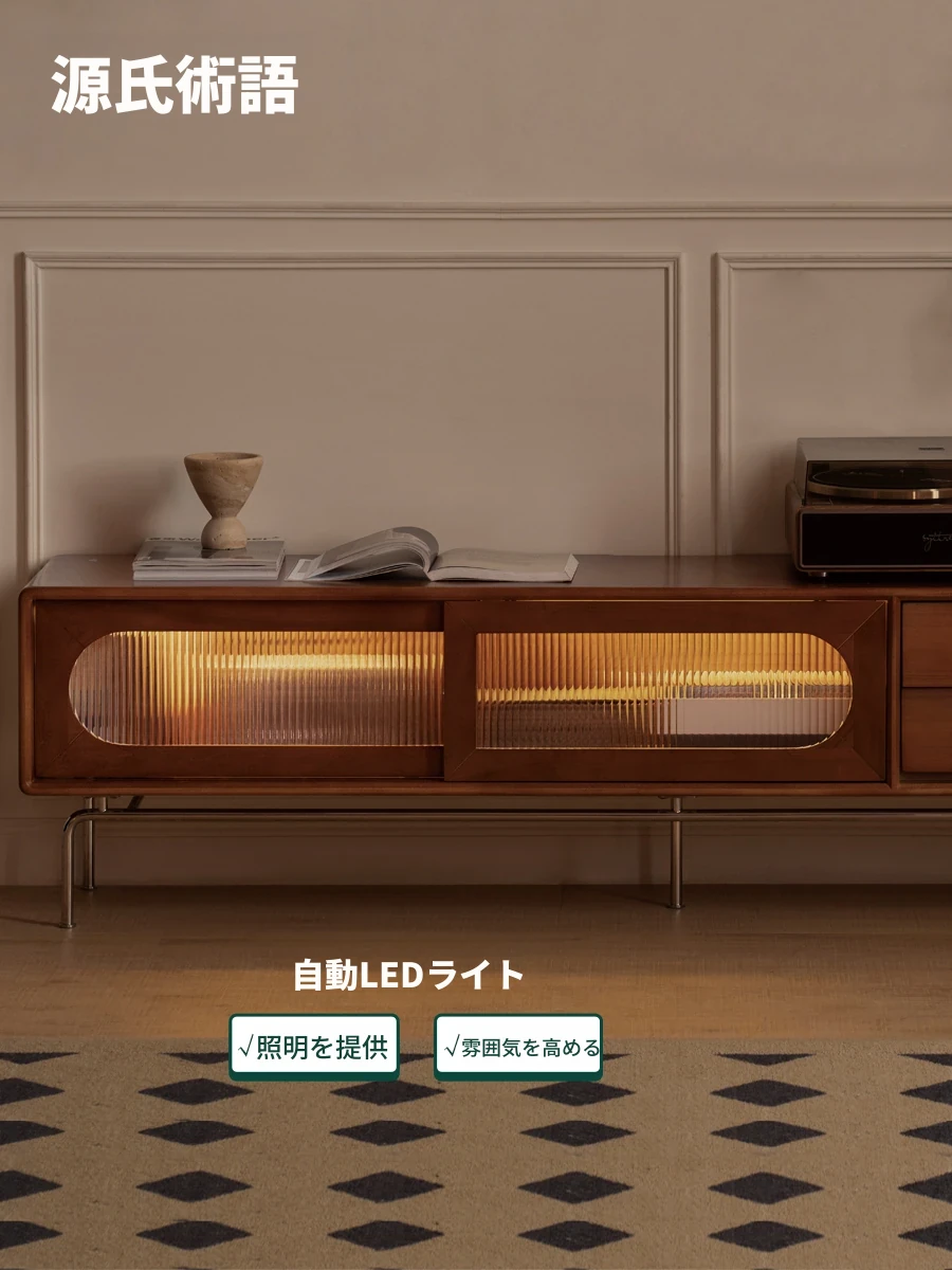 源氏木語の無垢材テレビボード - フランス風レトロガラス扉収納キャビネット!おしゃれなリビングにぴったりの中型ハイアンドロウ収納家具。高品質なデザインで、空間を美しく演出します!
