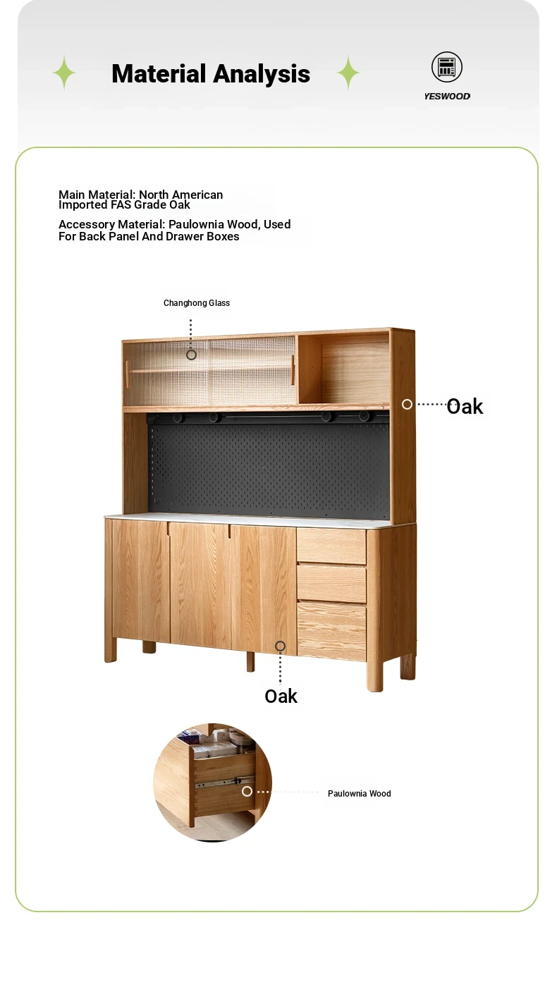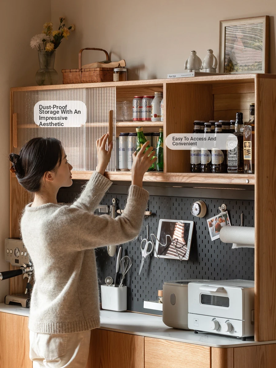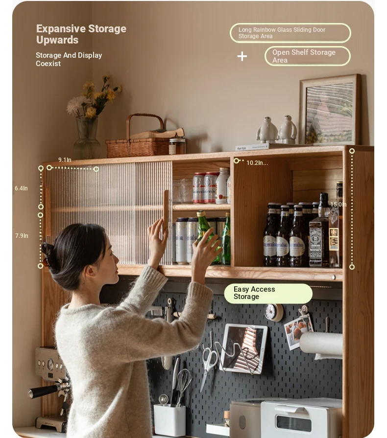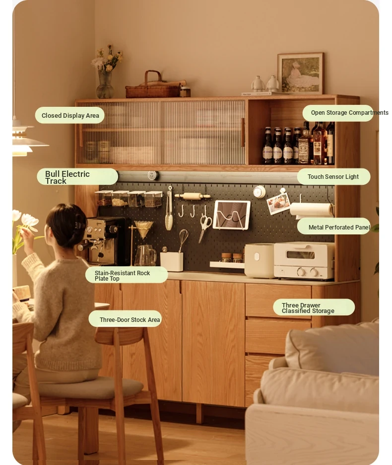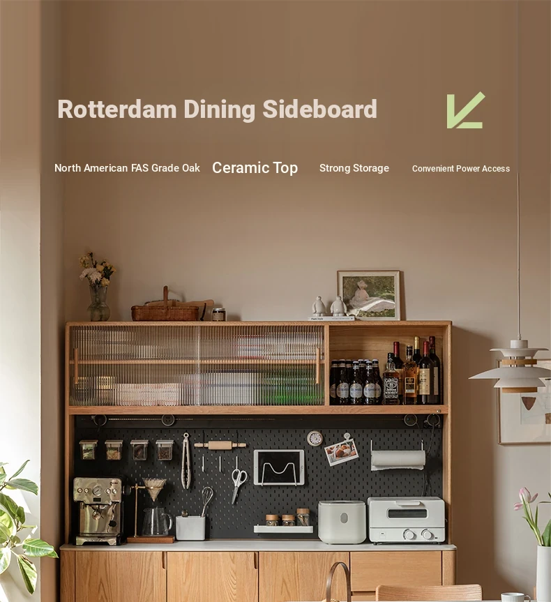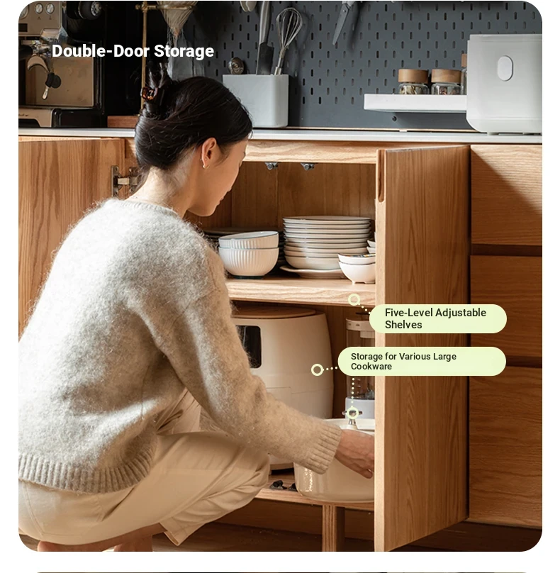 Genji MuYu Solid Wood Rock Plate Sideboard - Modern Minimalist High Cabinet with Pegboard, Tea and Coffee Storage for Home, Oak Organizer.