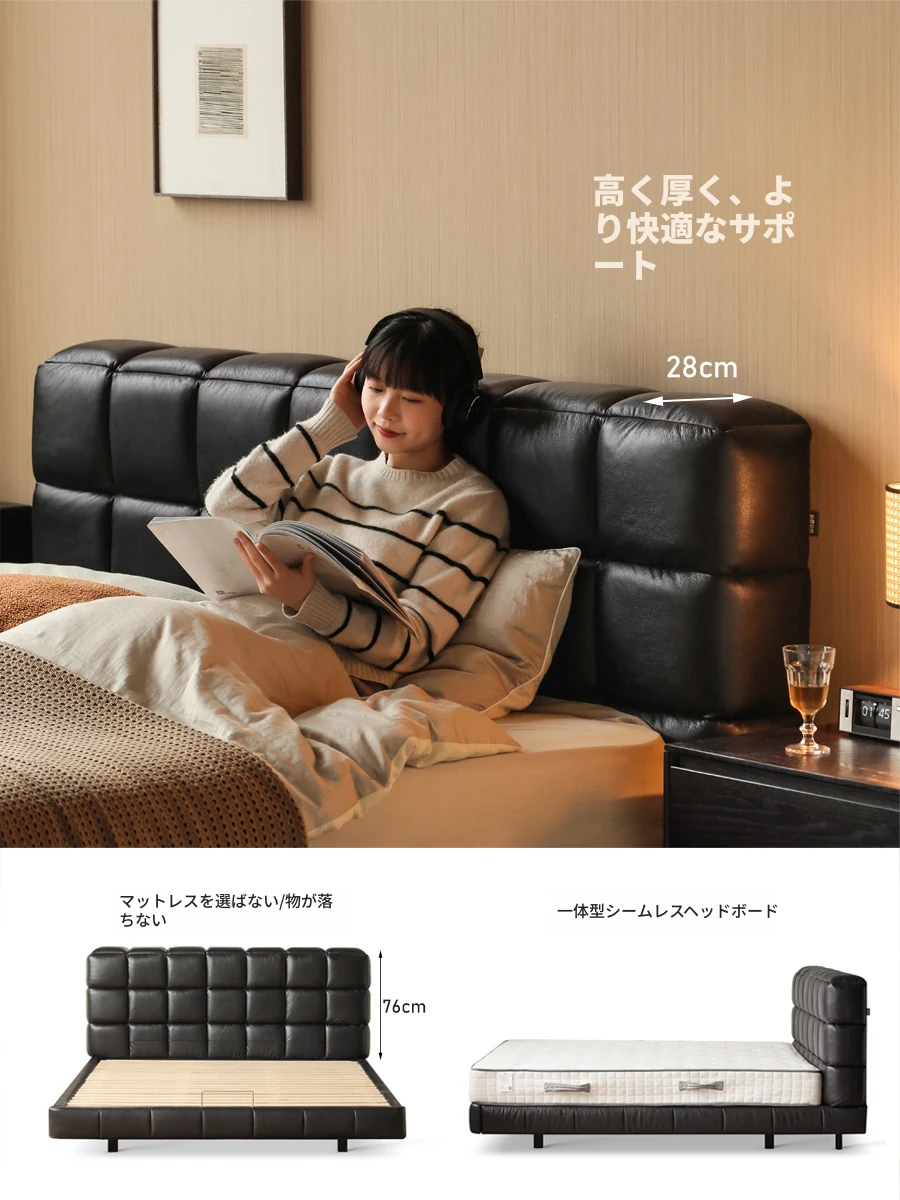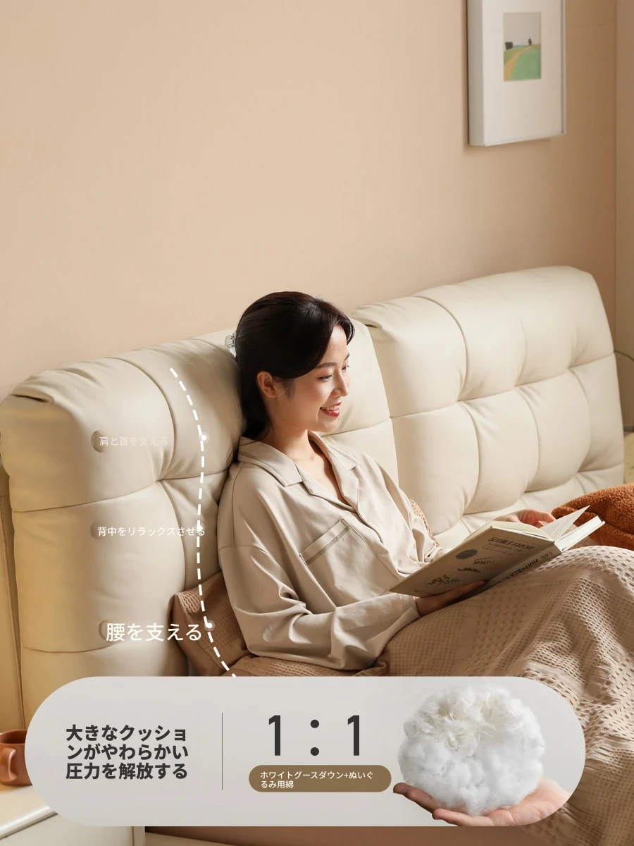 源氏木語 本革製ベッド|クリーム風デザインの浮遊型ダブルベッド|シンプルでおしゃれな寝室にぴったり|高級トップレザー使用|白色でエレガントな空間を演出します
