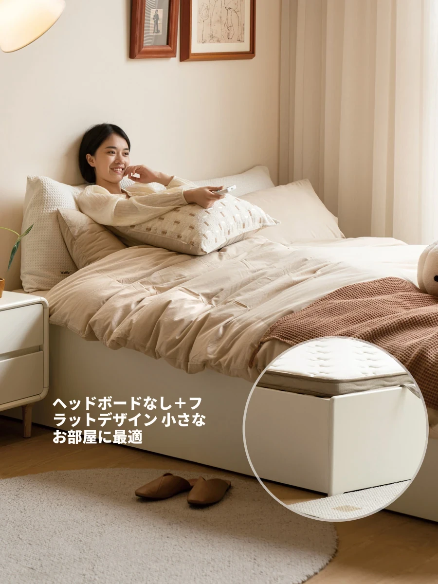 源氏木語のクリーム風無ヘッドボード本物の木製ベッド - シンプルでスタイリッシュなサイドオープンデザイン、ホワイトの畳付き収納ベッドで快適な睡眠空間を演出!