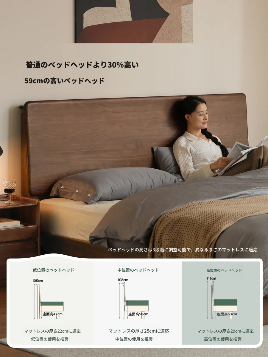 源氏木语 高級天然木製 ベッド - ブラックウォールナットの設計で、寝室にぴったりなスタイリッシュな浮遊感!高いヘッドボードが贅沢な印象を与えるダブルベッドで、心地よい眠りをお楽しみください。