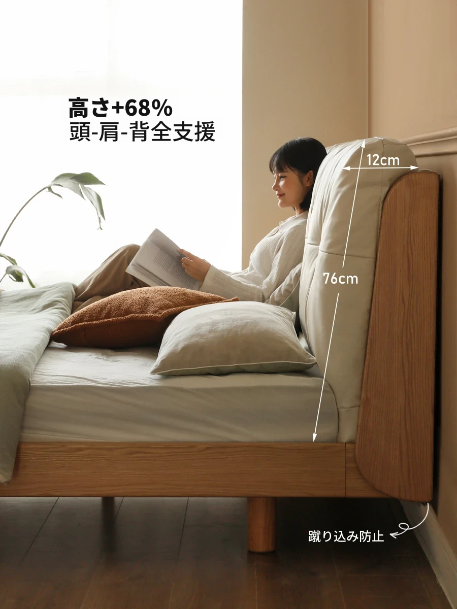 源氏木語の天然木製ダブルベッド|モダンでシンプルなデザイン|高級本革ソフトパッド付き|オークの無垢材で作られた浮遊感のある大きなベッド|快適な眠りをお約束!
