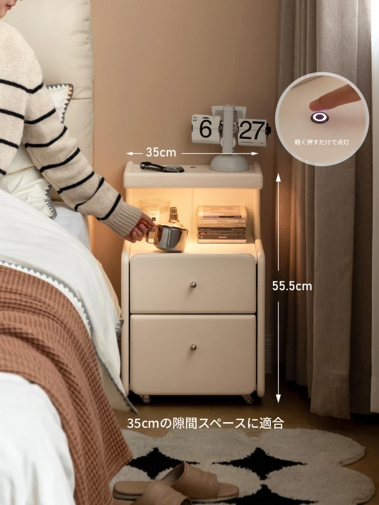 源氏木语実木ベッドサイドキャビネット・移動可能でホワイトのクリーム風ライト付き小型収納家具・寝室にぴったりの収納ボックス
